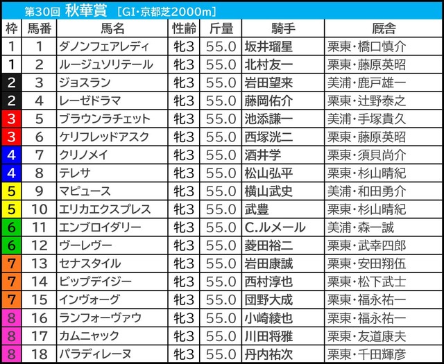 JRAは17日、第30回秋華賞(GI、京都芝2000m)の枠順を発表した。